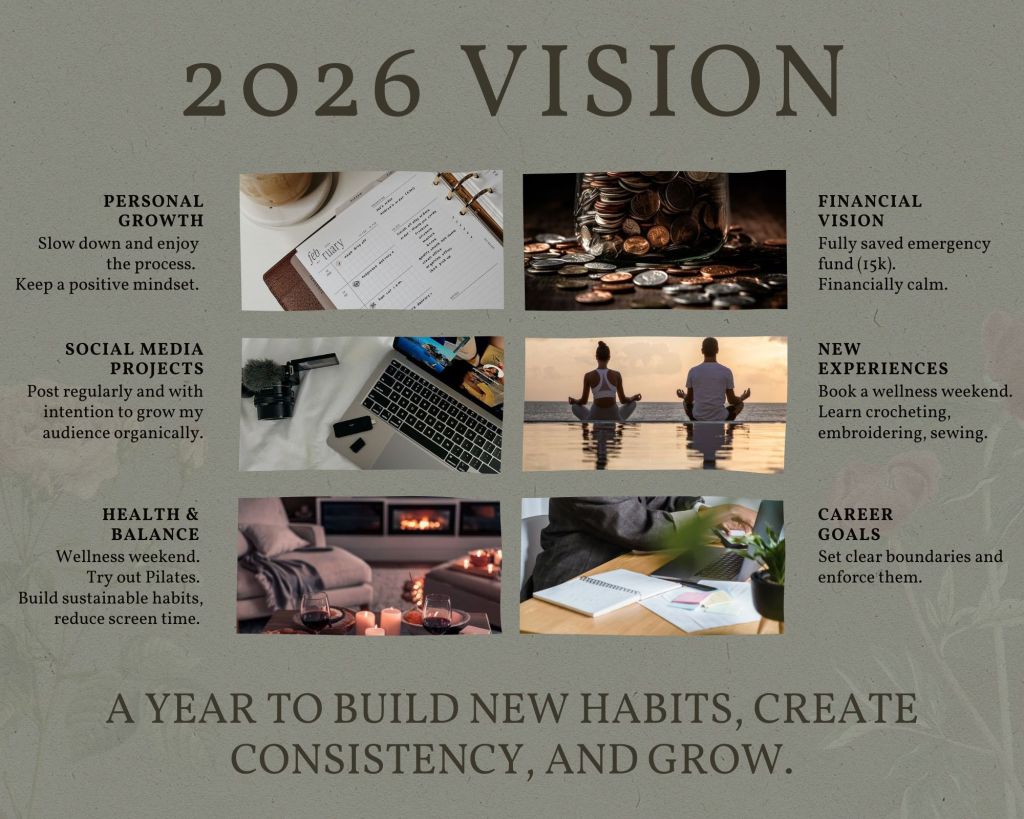 After making a Vision Board for 2025, I knew I also had to make one for 2026. I enjoyed the process of reflecting about my 2025 visions, and choosing new ones for 2026. The vision board helps me to stay intentional about my goals and visions for the year, and gives me a visual reminder. I want to make 2026 a year to build new habits, create consistency, and grow.